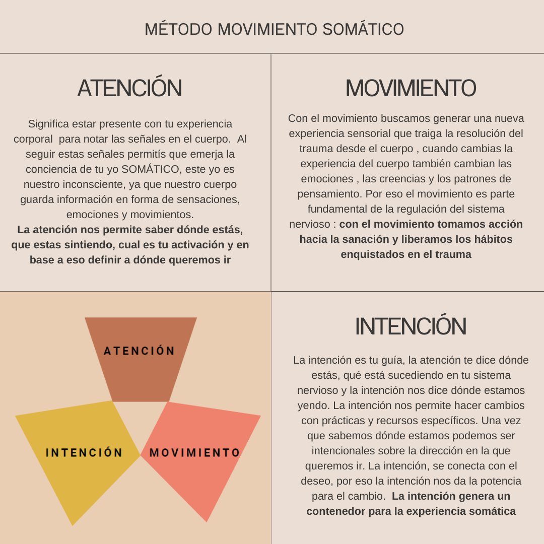 Movimiento Somático consiste en una amalgama cuidada que integra: Anatomía funcional y experiencial, Biomecánica, Liberación fascial, Respiración, Psicología Somática, Meditación, Técnicas de estimulación sensorial, Reentrenamiento Cerebral, Teoría Polivagal y Neurociencias, junto con la sabiduría de Oriente y la espiritualidad natural.